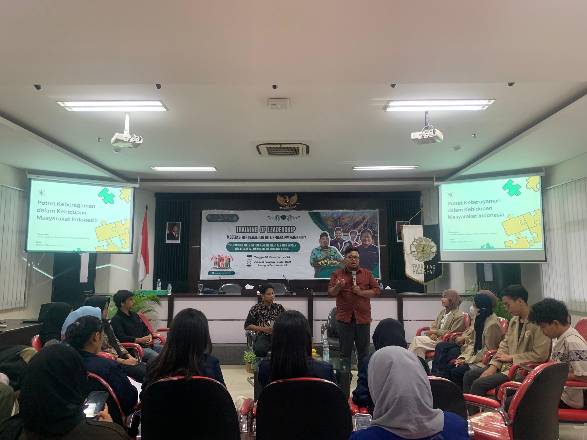 Program Training of Leadership Moderasi Beragama dan Bela Negara yang diselenggarakan oleh PW PMMBN DIY ini berlangsung pada Hari Minggu, 1 Desember 2024 di Ruang Persatuan Lantai 3 Gedung Fakultas Filsafat Universitas Gadjah Mada Yogyakarta.