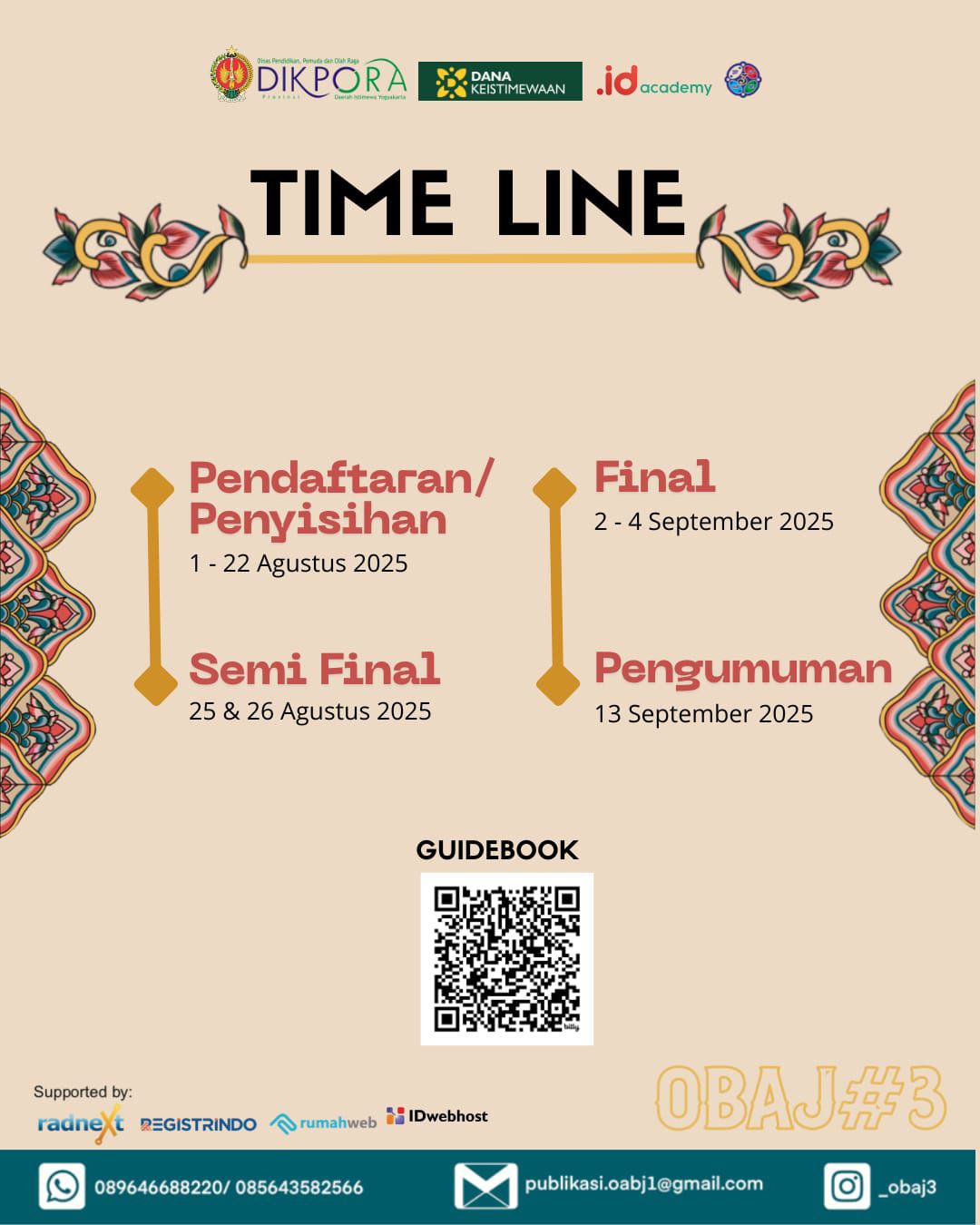 Pendaftaran peserta dimulai tanggal 1-22 Agustus 2025 ini. Tahap pendaftaran ini sekaligus sebagai babak penyisihan peserta di masing-masing kabupaten/kota. Setiap kabupaten/ kota akan diambil 40 peserta dari jenjang SMA/MA dan 40 peserta dari jenjang SMK. Peserta yang terpilih akan maju ke babak semifinal yang akan dilaksanakan pada tanggal 25 & 26 Agustus 2025. Selanjutnya dari babak semifinal akan dipilih 10 peserta dari masing-masing jenjang untuk mengikuti babak final. Untuk informasi lebih lengkap tentang teknis pelaksanaan OBAJ#3 ini, anda bisa mengakses laman www.olimpiadeaksara.id.